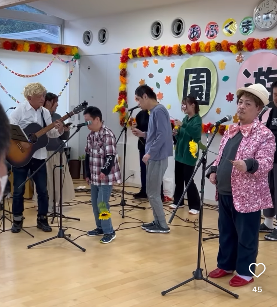 施設のスタッフさんがおっしゃるにはAKB48の「ヘビーローテーション」が大好きな方がいるということ。普段はほとんど話をしない方でおとなしい目立たない方・・・。それで当日「ヘビーローテーション」を演奏すると、学生も一生懸命振り付けを覚えてくれました。曲が始まるとその方がゆっくり前に出てきたかと思うとセンターに立ってほぼ完ぺきに踊って見せてくれました。それを見たスタッフさん「あんな姿初めて見ました!」と感激しておられました。